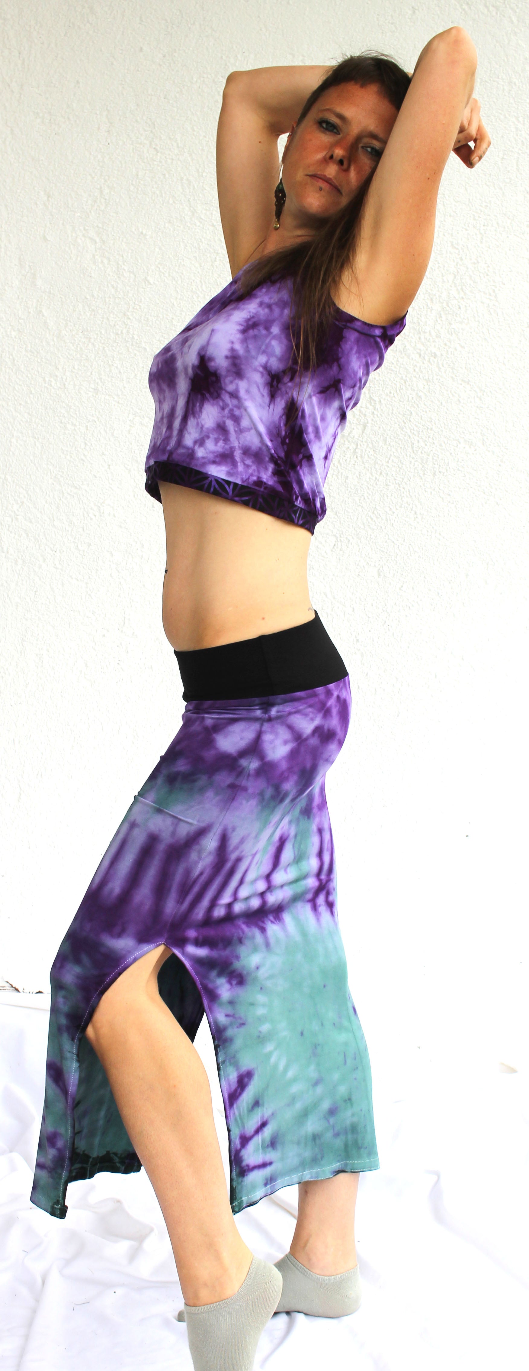 This maxi skirt stands out with its hand-tie-dyed pattern of green and purple, made with eco-friendly dyes.