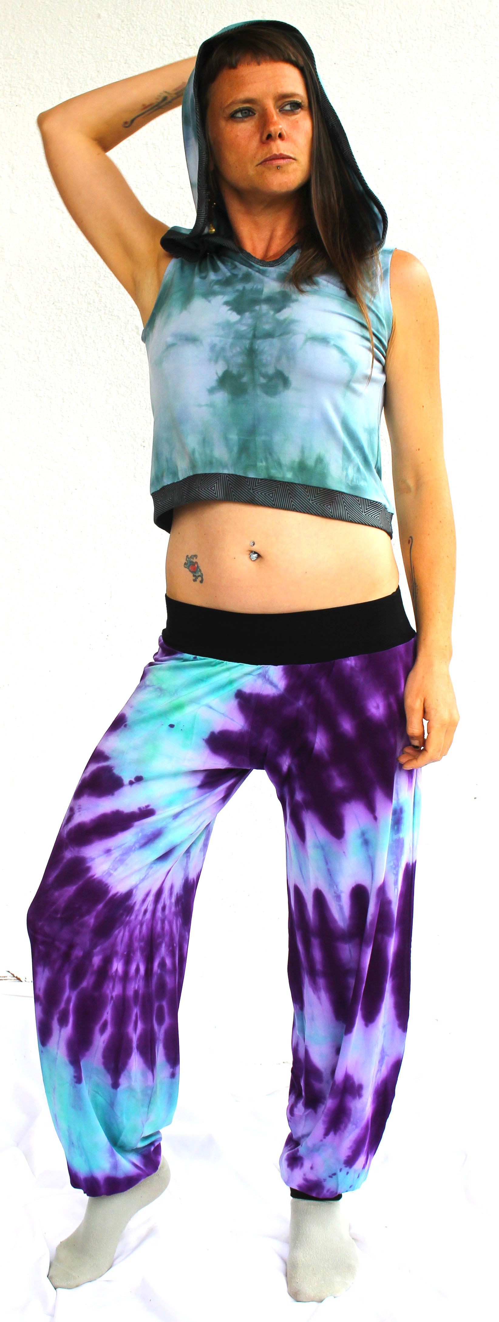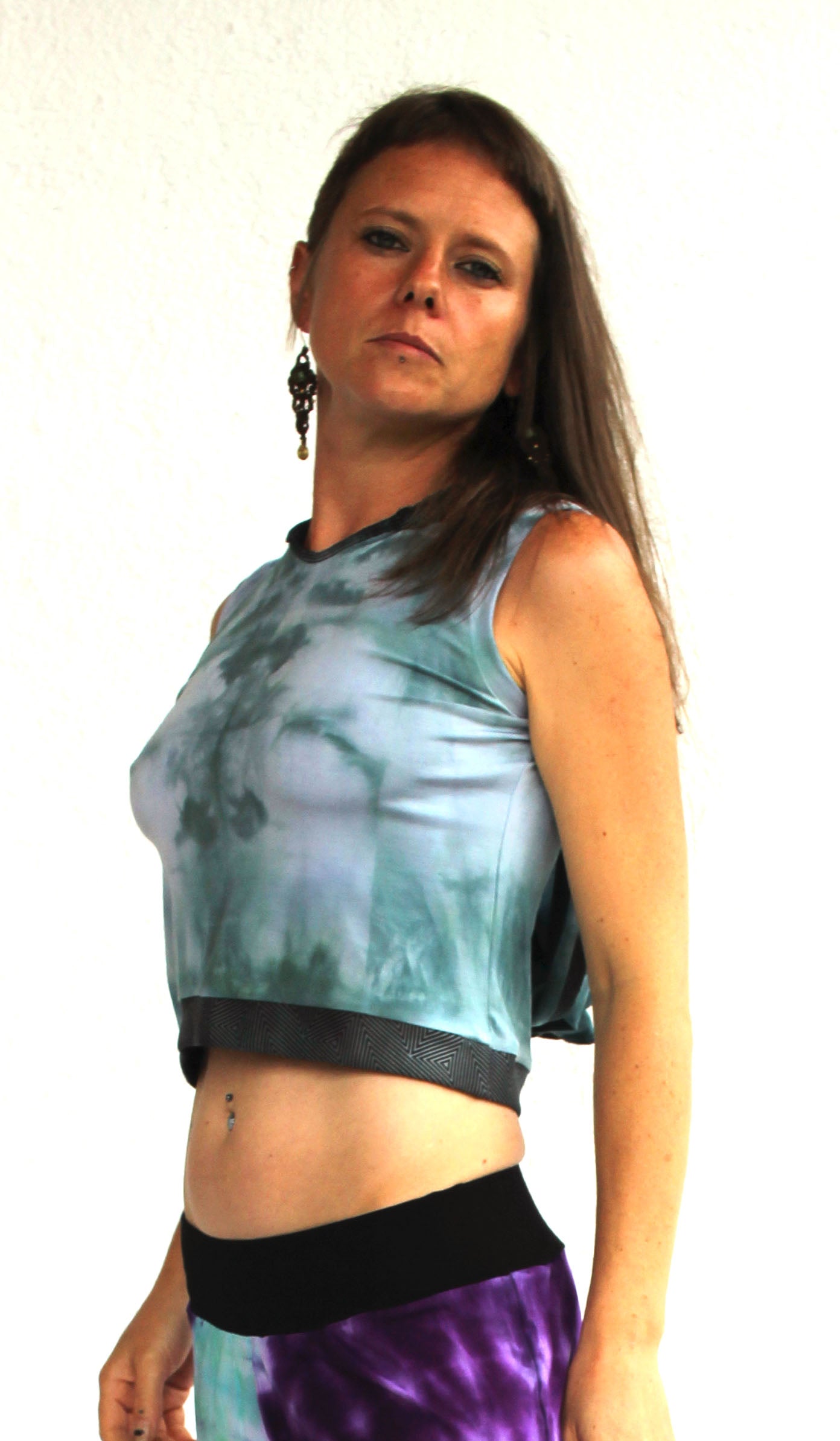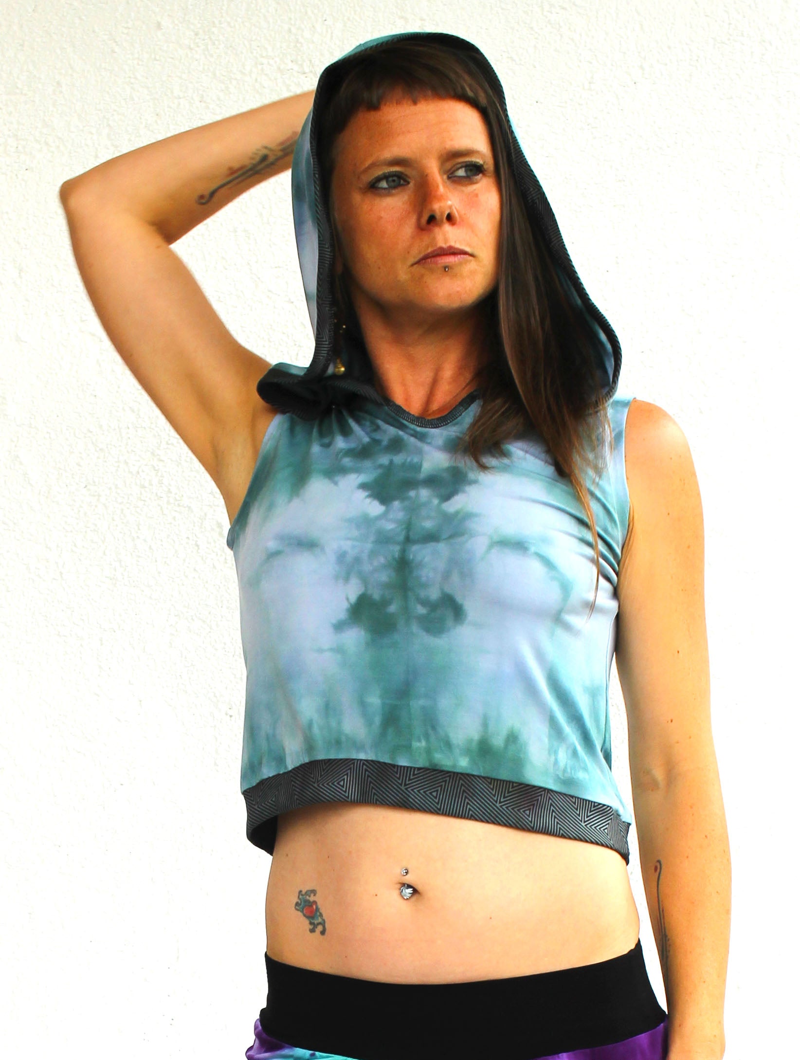 This Bamboo Hooded Crop Top features a tie dye design and GOTS approved organic cotton printed geometric trippy patterned hood trim and band on the bottom. Crafted from soft, thermic, breathable bamboo fabric, which is hypoallergenic, eco-friendly, resistant and washable, it is also protects from UV rays. This super-natural, eco-friendly item is handmade in Portugal and features an elastic fit for a fashionable look.