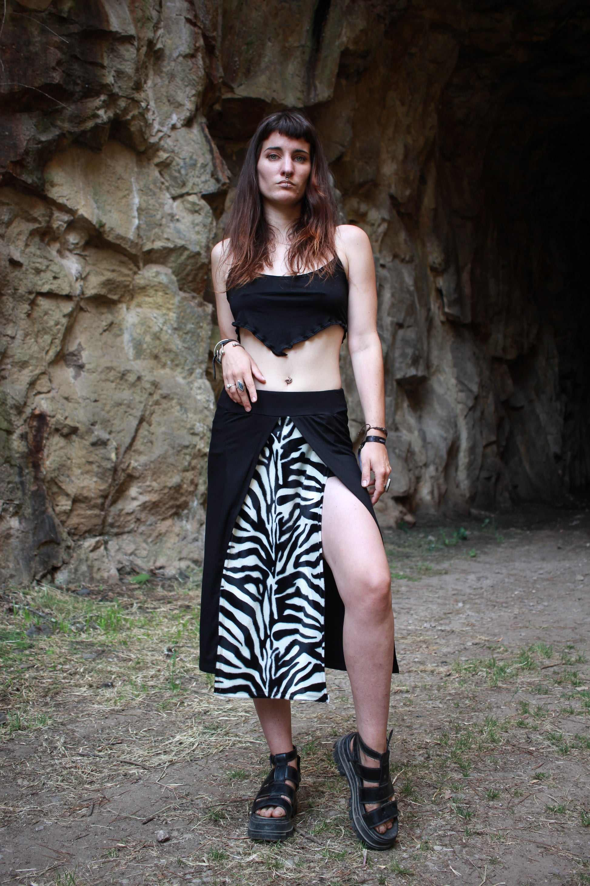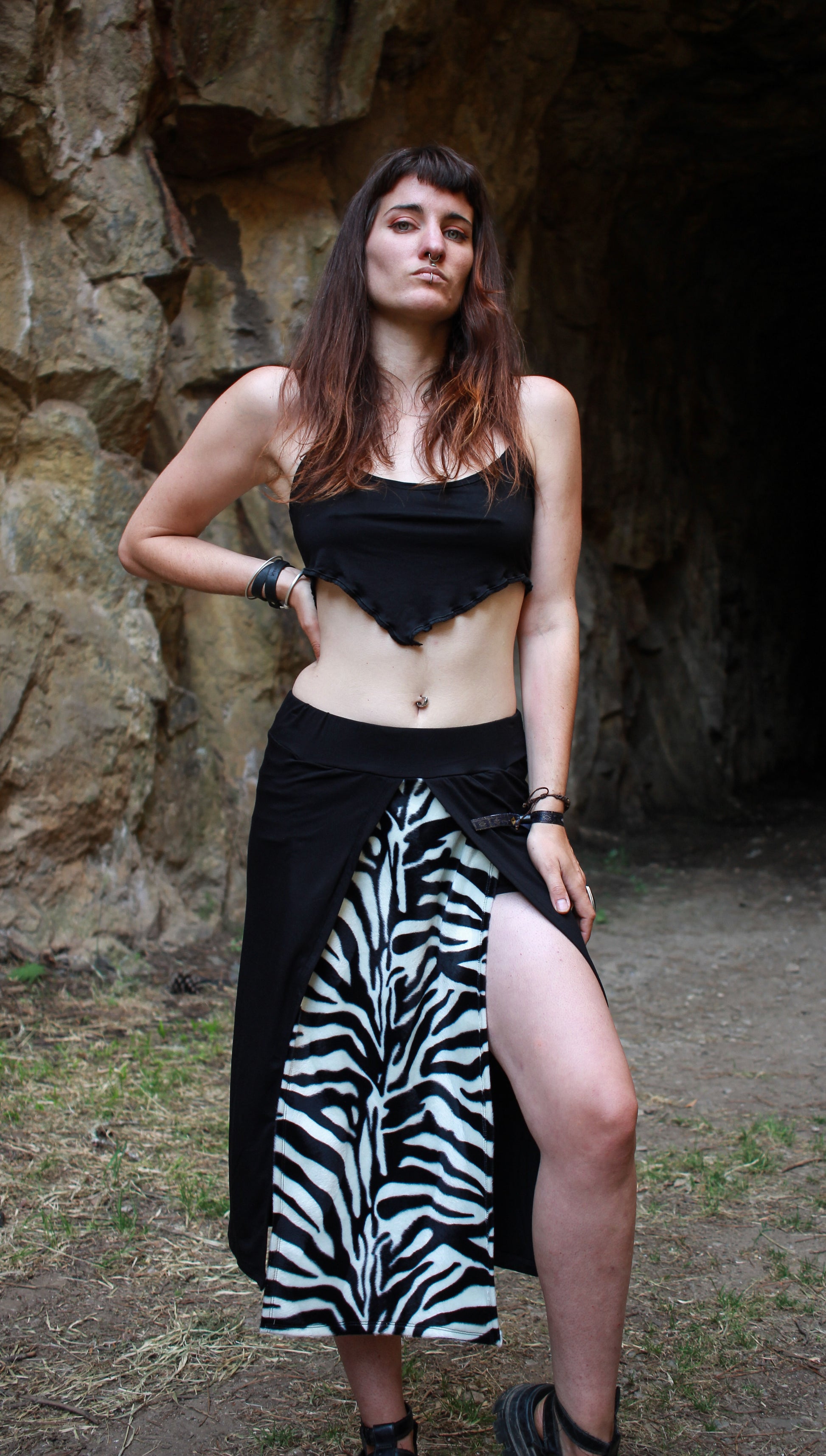 Super soft wild zebra maxi length skirt with splits along both sides creating a front panel for extra comfort and style, made using black bamboo fabric and zebra patterned fabric from my deadstock fabric collection (read all about deadstock fabrics in one of my blogs) with a raw elastic waistband.